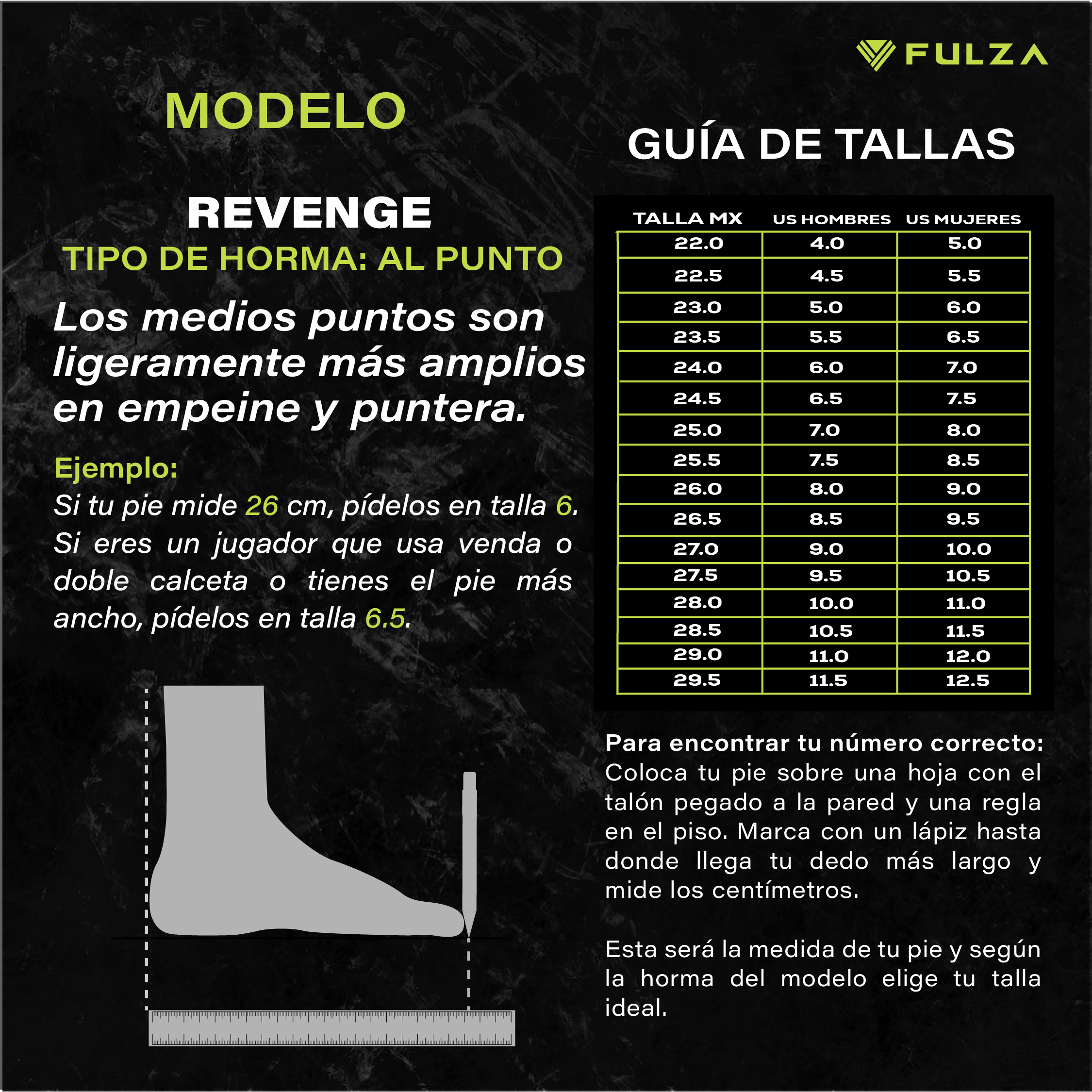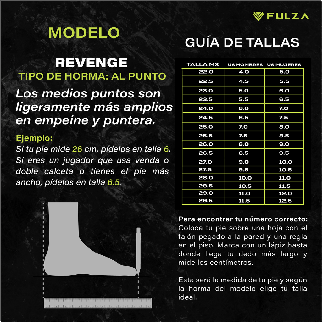 - REVENGE V. Tacos diseñados para el dominio del juego. Combinan piel vacuna de alto ajuste y tecnología Fulza-Knit que brinda soporte sin sacrificar movilidad. Ideales para jugadores que priorizan el control del balón y los cambios de ritmo. Ideal para campos de pasto natural y sintético.