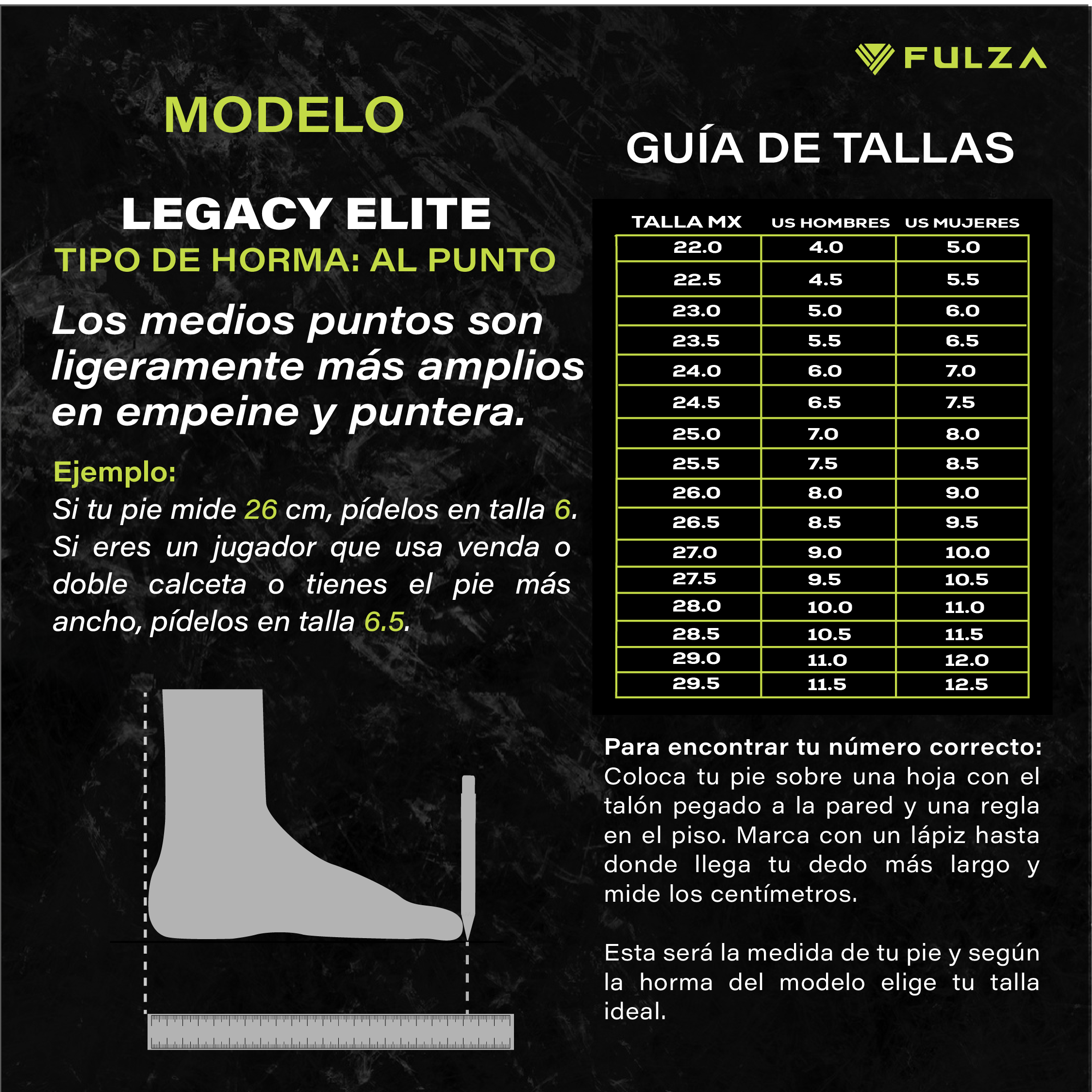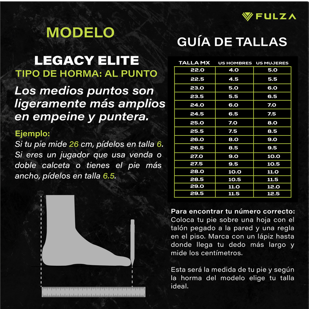 Al punto. Los medios puntos son ligeramente más amplios en empeine y puntera. Ejemplo: -Si tu pie mide 26 cm pídelos en 6. -Si tú eres jugador que usa venda o doble calceta o de pie más ancho. Pídelos en 6.5 numeración disponible del: 22 al 29.5 Ideal para niños y adultos Genero. Unisex.